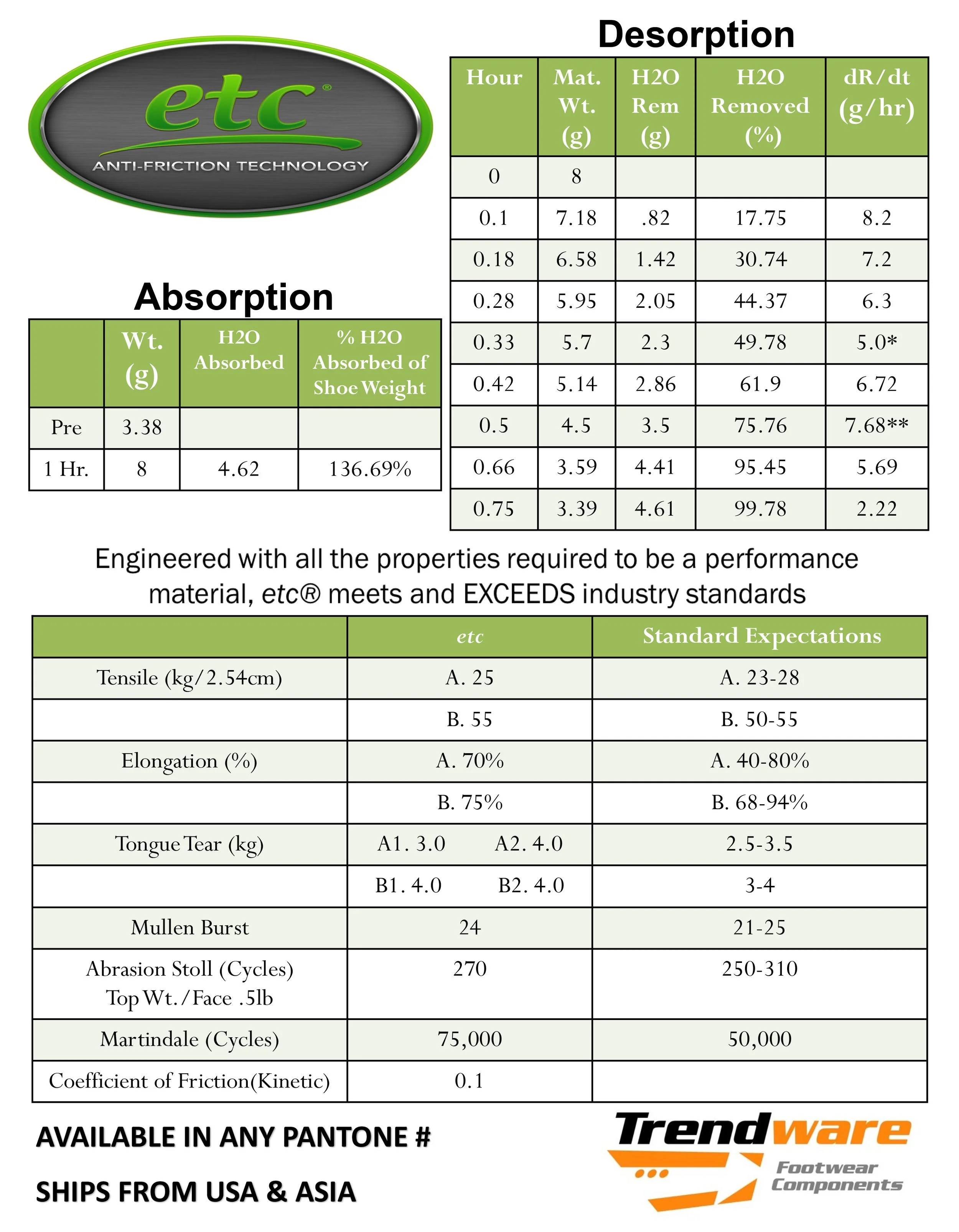 Reducing friction to almost zero, reducing moisture and heat and bringing comfort and extended wearability to previously unattainable levels. Highly durable, breathable and colorfast. Don’t just wick, suck, store or move moisture… attack it at the source… eliminate the cause. Without etc. anti-friction lining, you’re just wearing shoes.